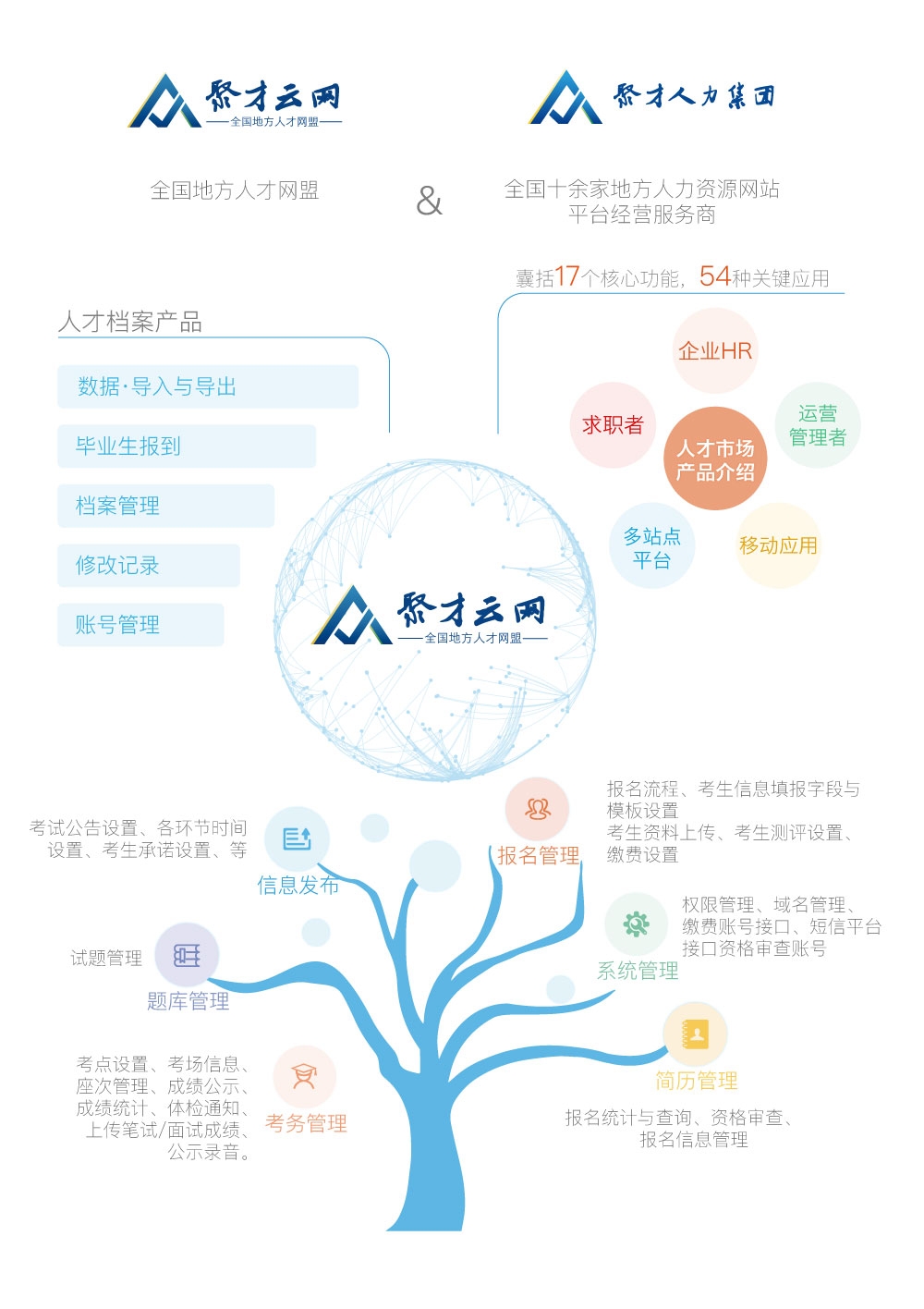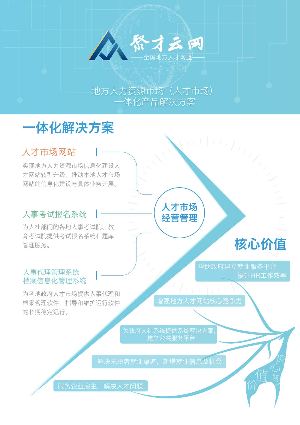 聚才云網(wǎng)核心價(jià)值是為地方人力資源市場(人才市場)提供專業(yè)技術(shù)服務(wù)與產(chǎn)品的一體化解決方案,主要產(chǎn)品有:地方人力資源市場信息化解決方案和人才網(wǎng)站轉(zhuǎn)型升級(jí)、人事代理管理系統(tǒng)和檔案信息化管理系統(tǒng)、人社部人事考試院(中心)信息化解決方案和人事考試報(bào)名系統(tǒng)。可解決現(xiàn)有地方政府提供優(yōu)秀的管理工具和與業(yè)務(wù)平臺(tái),推求職者就業(yè)渠道,新增就業(yè)信息機(jī)會(huì),服務(wù)本地化企業(yè)雇主,解決人才引進(jìn)與管理的問題,增強(qiáng)地方人才網(wǎng)站核心競爭力,為省、市、動(dòng)政府在人社服務(wù)互聯(lián)網(wǎng)平臺(tái)的建設(shè)。